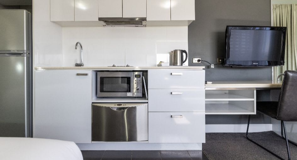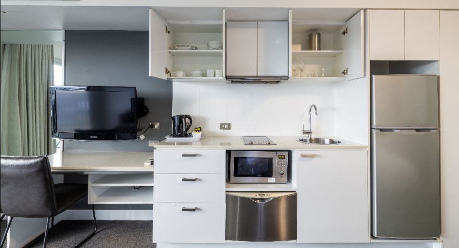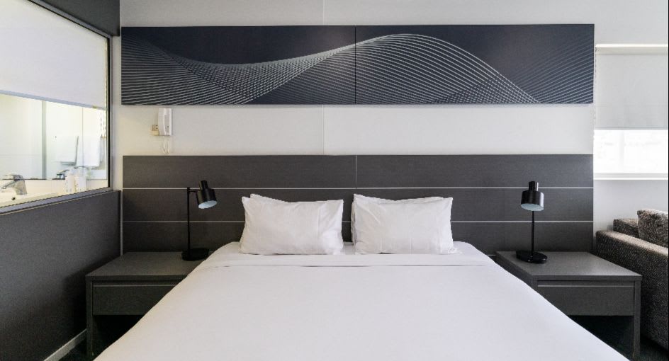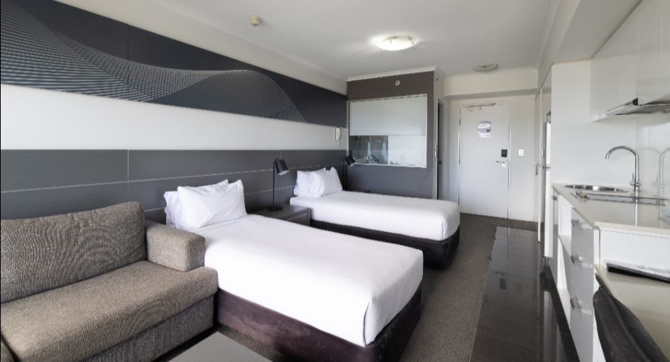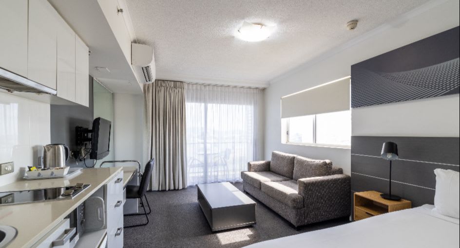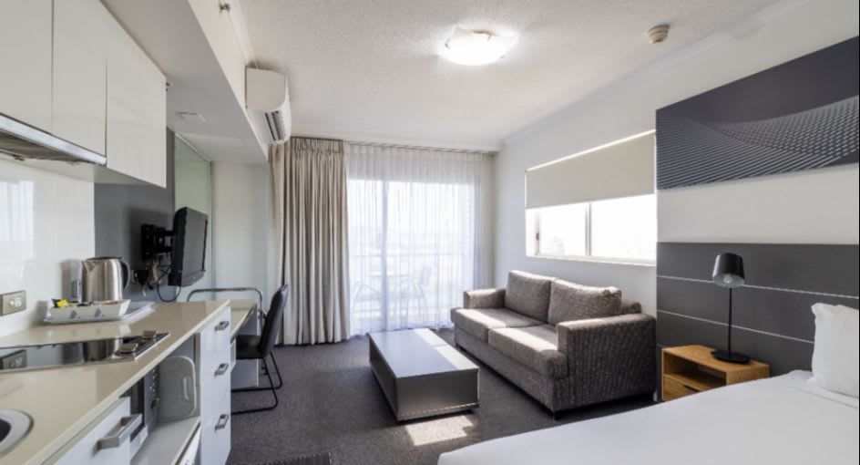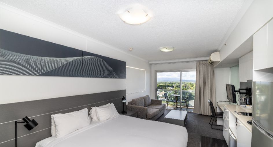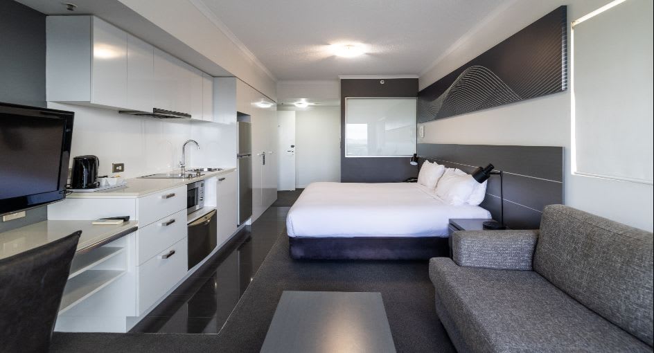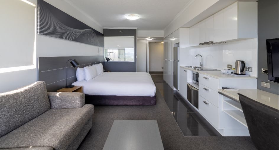 Inside, we’ve got the amenities sorted. Large open plan layouts, king beds, modern kitchenettes with laundry facilities, and work desks for you spreadsheet warriors. When you're ready to get moving, there’s a gym and swimming pool to get your blood pumping.